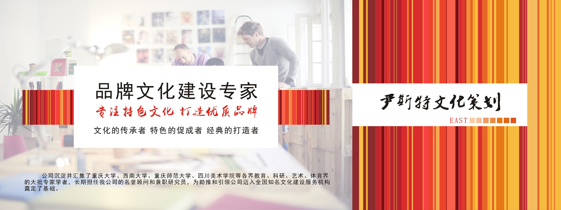 重慶尹斯特文化傳播有限公司全體同仁堅守“文化的傳承者,特色的促成者,名企的打造者”的服務宗旨,齊心協力,不斷進取,攜手為西部乃至全國的企業(yè)策劃和企業(yè)文化建設事業(yè)作出新的貢獻。